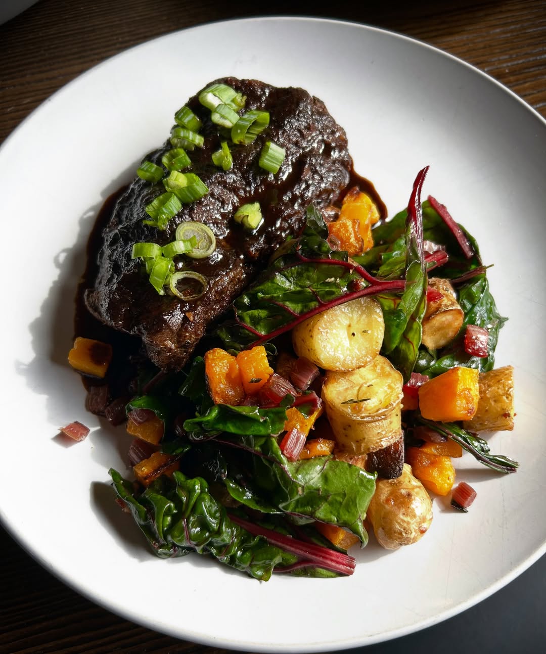 Another autumnal take at TRiO: Red Wine Braised Short Ribs - with sautéed beef tallow rosemary garlic fingerling potatoes, swiss chard, cherry tomatoes, and butternut squash